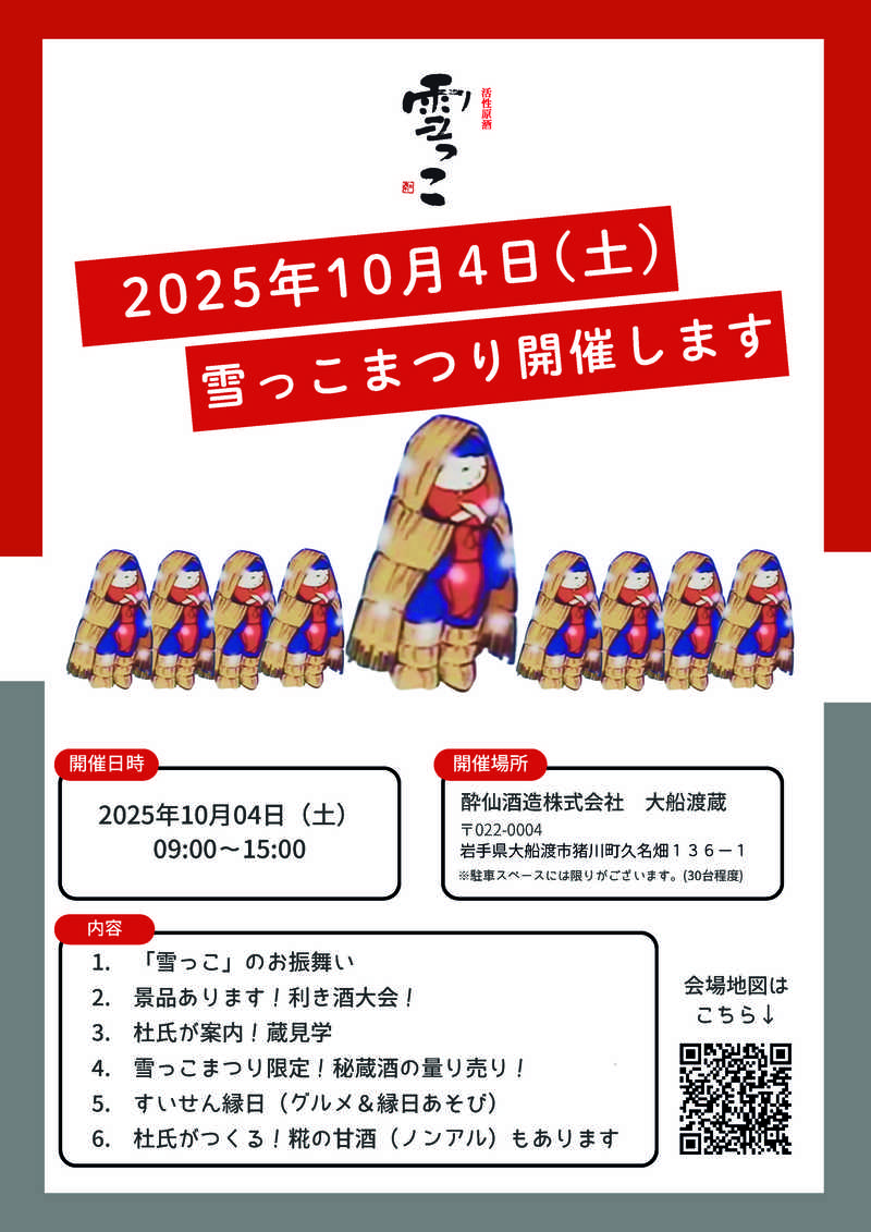 当日は雪っこのお振舞いや利き酒大会、お祭り限定の秘蔵種量り売りもありますよ!お子様むけの縁日も⭐︎